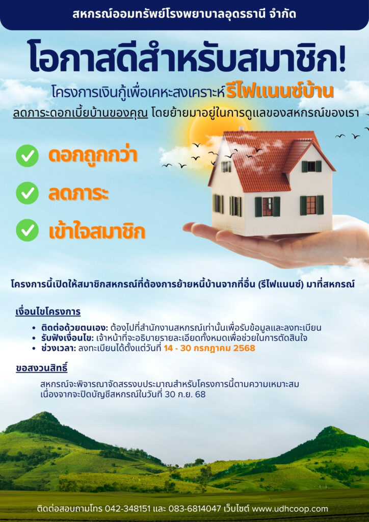 สหกรณ์ขอเชิญสมาชิกเข้าร่วมโครงการเงินกู้เพื่อเคหะสงเคราะห์ (รีไฟแนนซ์บ้าน) ช่วยลดภาระดอกเบี้ย และเพิ่มสภาพคล่องทางการเงิน ด้วยการย้ายภาระหนี้จากสถาบันการเงินอื่นมาอยู่ในการดูแลของสหกรณ์