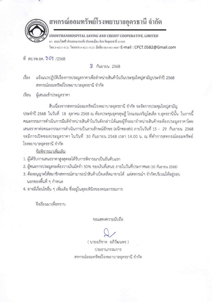 ขอเชิญร่วมประมูลพื้นที่จำหน่ายสินค้าในงานประชุมใหญ่สามัญ ประจำปี 2568